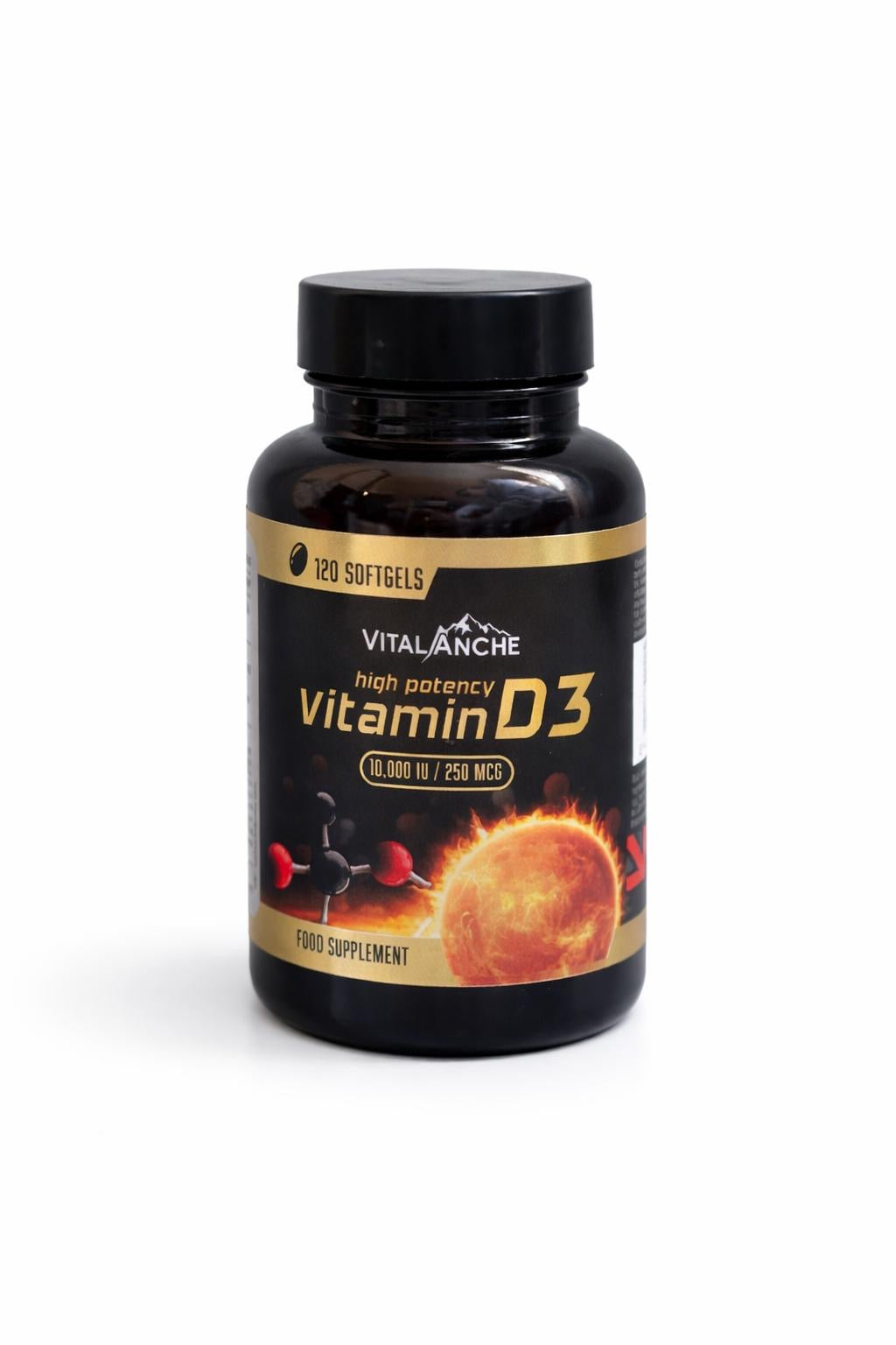 VitalAnche High Potency Vitamin D3 delivers 10,000 IU (250 mcg) of Vitamin D3 (Cholecalciferol) per softgel, providing powerful nutritional support in a convenient, once-daily capsule. Vitamin D plays a vital role in maintaining overall health and wellbeing, particularly for bones, muscles, and immune function.